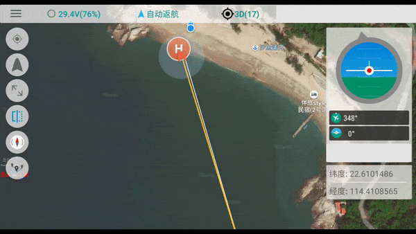 隨后可以打開遙控上的一鍵返航鍵,R1會(huì)自動(dòng)回到出發(fā)地,不需其它操作,全程無人化運(yùn)作