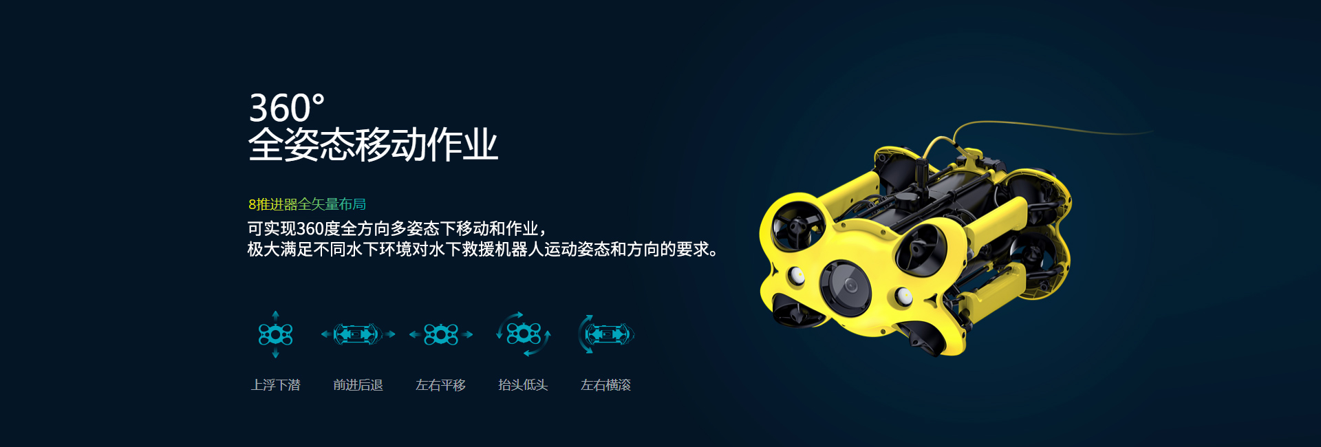 360°全姿態移動作業:8推進器全矢量布局,可實現360度全方向多姿態下移動和作業,極大滿足不同水下環境對水下救援機器人運動姿態和方向的要求。
