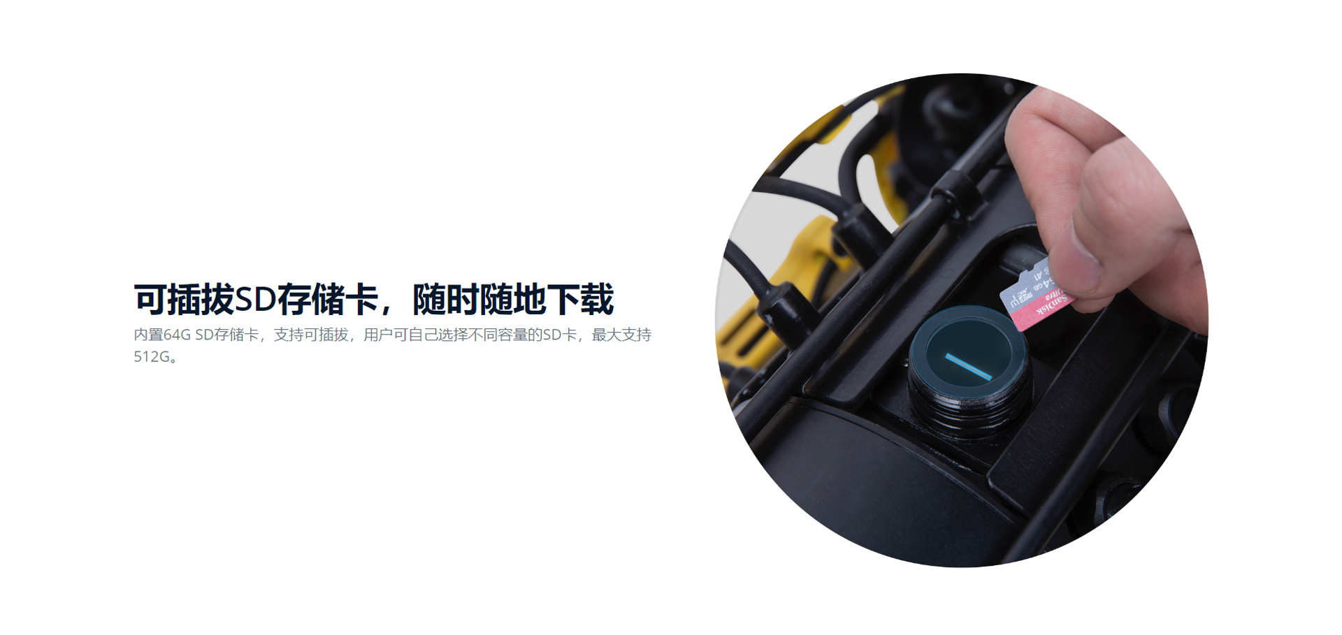 可插拔SD存儲卡,隨時隨地下載:內置64G SD存儲卡,支持可插拔,用戶可自己選擇不同容量的SD卡,最大支持512G。
