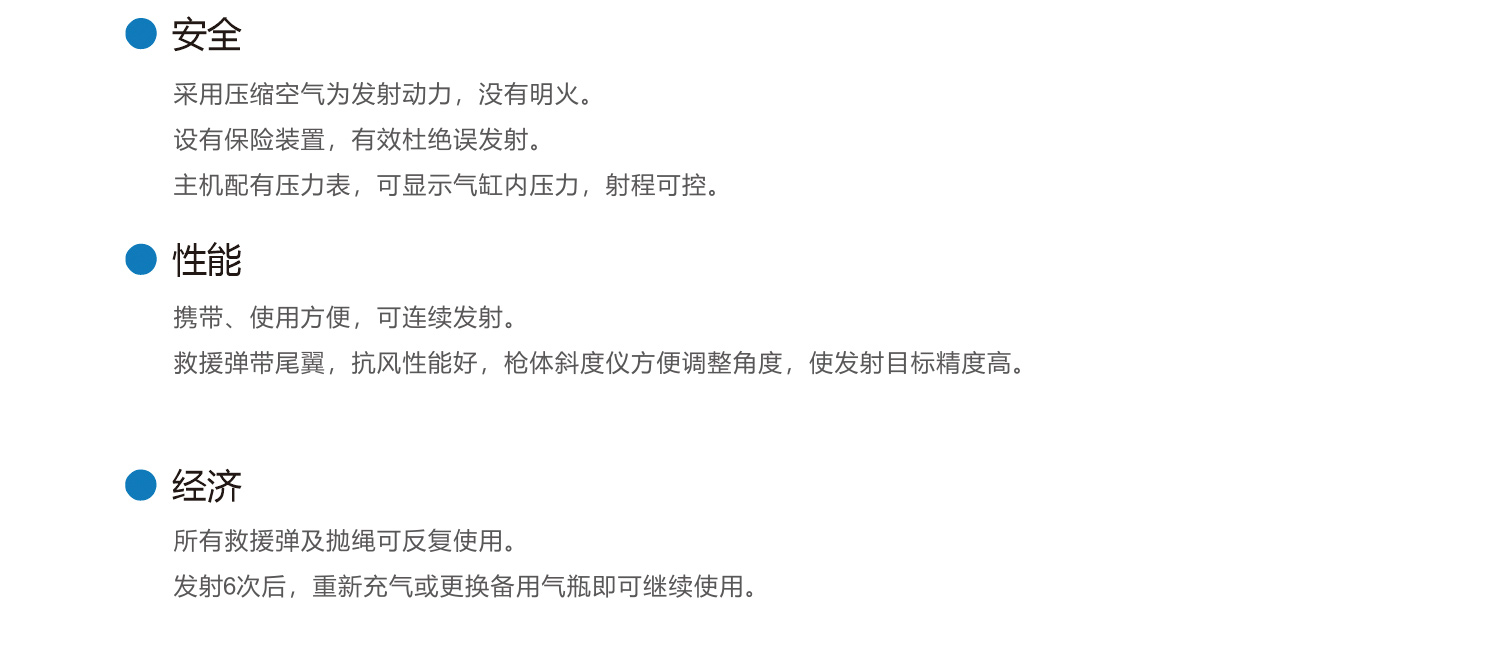 可折疊的槍托在使用和攜帶上更加方便,有保險裝置使用更安全,拋投距離更遠,性能更穩定;適用于船對船、船對岸、高樓和山澗的拋繩和救援使用。