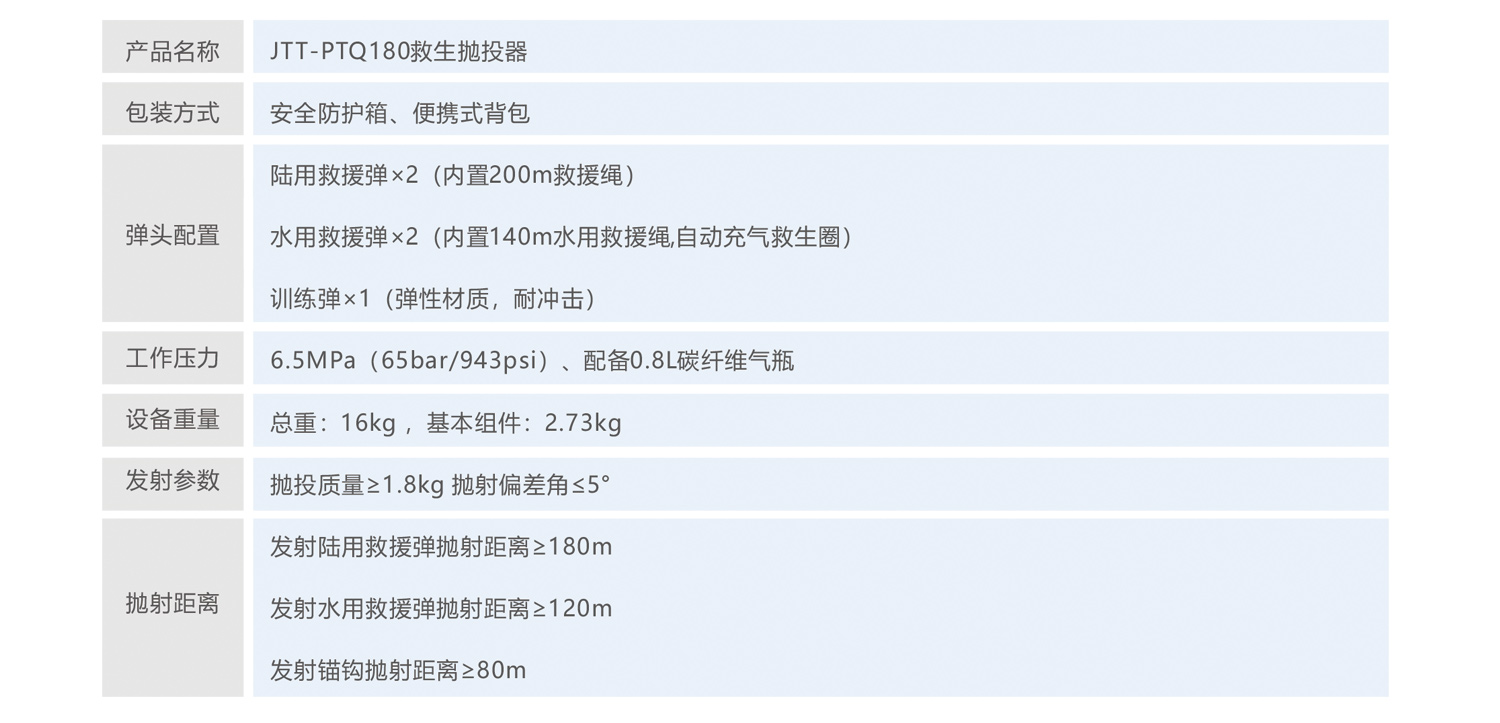 JTT-PTQ180救生拋投器主要應用于拋投救生繩、救生圈或錨鉤等救生設備,是以壓縮空氣為動力的便捷式救生拋投器。