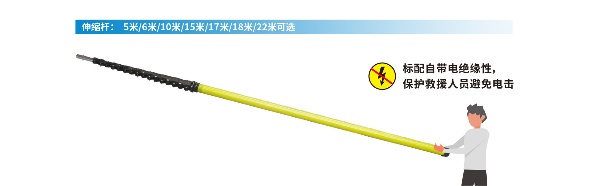 可以在任意水面上進(jìn)行5米;6米;10米;15米;17米;18米;22米,快速救援有意識(shí)或者無意識(shí)人或者動(dòng)物,減少人員傷亡的最有效工具,也大大降低了救援人員傷亡風(fēng)險(xiǎn),提高救援效率,多功能救援頭可以根據(jù)救援環(huán)境,任意快速調(diào)換救援頭,達(dá)到最佳的救援效果;其中炭纖維伸縮桿在救援人員手握部位采用具有電絕緣性的玻璃鋼材質(zhì),電壓等級(jí)≥9.5KV,避免救援人員觸碰到高壓線等情況出現(xiàn)電擊,極大保障了救援人員的生命安全。