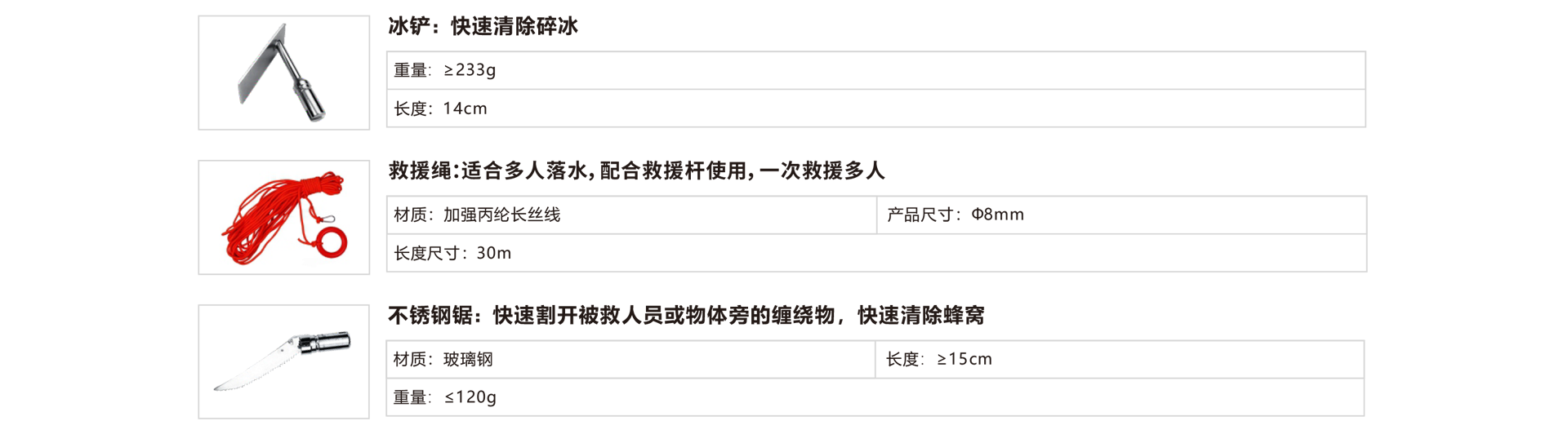 救援繩:適合多人落水,配合救援桿使用,一次救援多人