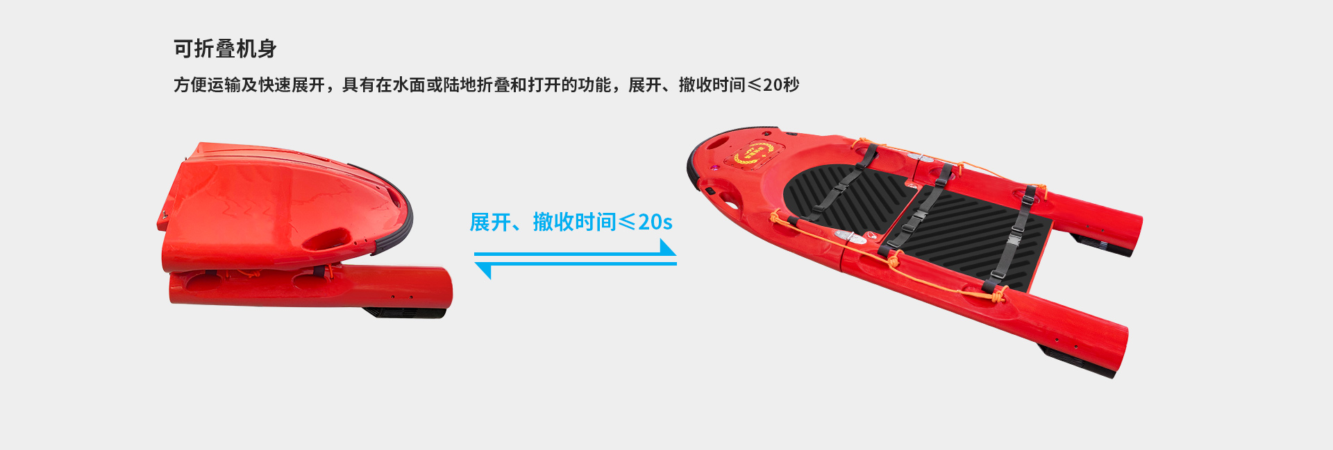 可折疊機(jī)身:方便運輸及快速展開,具有在水面或陸地折疊和打開的功能,展開、撤收時間≤20秒;