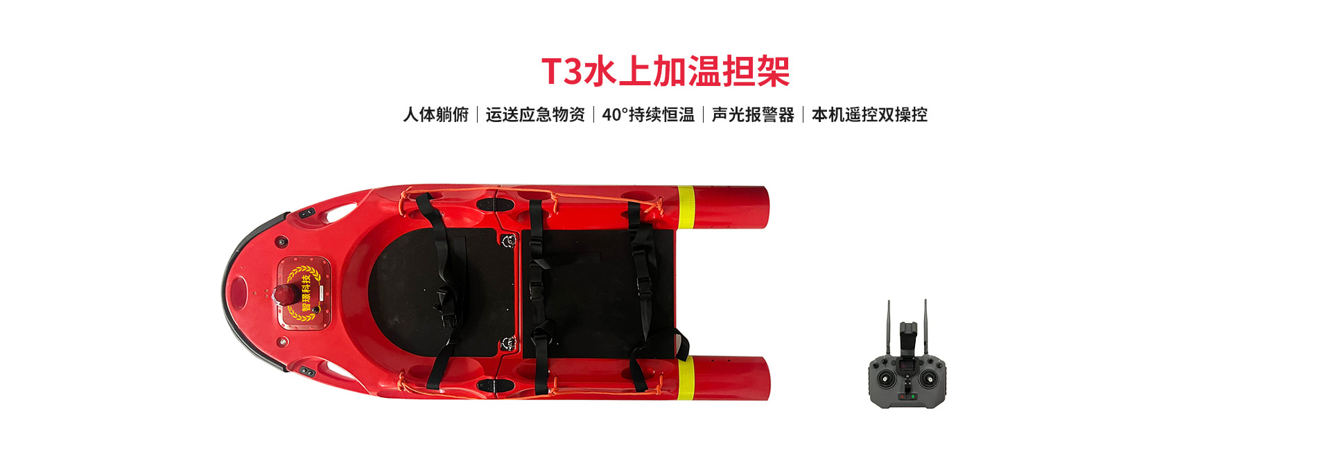 T3水上加溫?fù)?dān)架是一款政府應(yīng)急、民間各類水上救援組織的標(biāo)準(zhǔn)救援設(shè)備,應(yīng)用于水上應(yīng)急救生、昏迷者救助、應(yīng)急物資運送等場景,便于人體躺俯和運送應(yīng)急物資;遇到險情,無須充氣,直接展開便可投入救援工作中,以6米/秒的速度抵達(dá)事發(fā)地點,將落水者安全轉(zhuǎn)移。具備遙控/本機(jī)控制模式,遙控端可實時顯示電量、距離等信息;支持加溫功能,在低溫環(huán)境下保證傷者體溫,安全有效搶救生命。此外,擔(dān)架還配有2條安全綁帶和9個把手,可牢固固定傷者,避免二次傷害;配備聲光報警器,便于夜間、雨霧天氣實施救援。