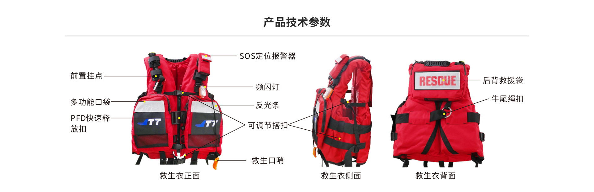 救生衣配備活餌快卸系統(tǒng):環(huán)繞胸部腰帶一條,寬5cm的尼龍織帶使用一組不銹鋼日型環(huán)及塑鋼固定,拉環(huán)上配置一根快速牽引繩可以固定于肩部,不影響救援動(dòng)作